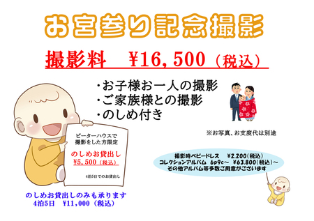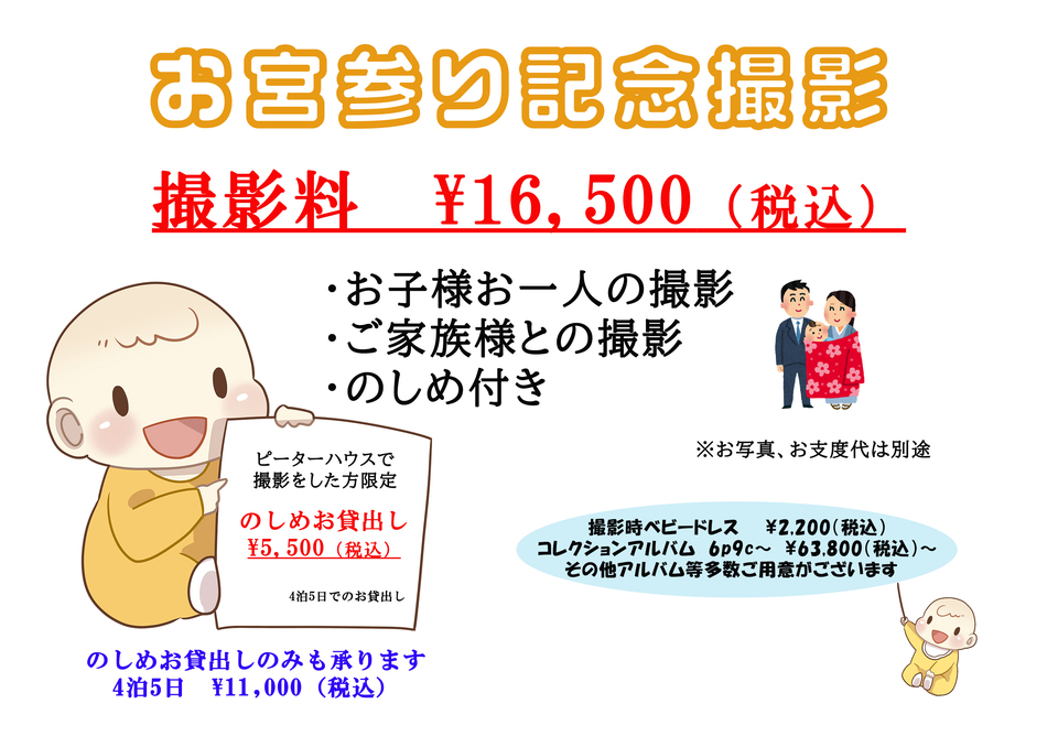 撮影メニュー お宮参り お宮参りに節句...お子様の行事もお任せください。 お子様が生まれてから、記念日の連続かと思います。 佐沼屋写真館ピーターハウスでは、七五三だけでなく、お宮参りや節句、その他記念日などの撮影も行っております。 料金 フォトギャラリー 衣装一覧 料金 お宮参り新プラン ♥祝着の貸し出し お出掛け無料(4泊5日)♥おむつ替えの出来るベビーベッドのご用意もあります お宮参りとは...赤ちゃんが生まれたことをその土地の氏神様にお参りして、守ってもらえるようにする行事です。清吾、男子30日目、女子31日目と言われていますが、赤ちゃんの健康を考え天候の良い日をお選びください。 ※アルバム・写真のお渡し方法 コロナ対策の一環として、郵送させていただきます。 ※衣装持ち込みについて 当店の衣装ではない場合、衣装持込保管料¥22,000(税込)をいただきます 撮影ご予約お申し込みはこちら レンタル衣装お問い合わせはこちら お電話でのお問い合わせ0120-61-3769